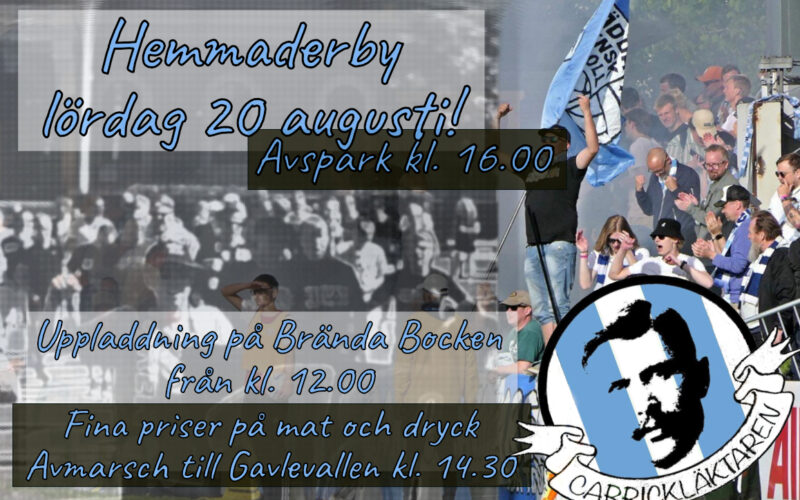Lördagen den 20/8 är det dags för säsongens andra derby och denna gång står Gefle IF som värd. Junimatchen slutade 2-2 efter ett sent kvitteringsmål från rödvästarna, visst kan vi vänta oss en minst lika rafflade tillställning som då. Tabellen talar sitt tydliga språk – det är vi och Sandviken som konsekvent legat i toppen. Derbyt kan komma att bli en avgörande faktor som man blickar tillbaka mot när man sammanfattar säsongen i vinter. Denna gång har Carrickläktaren sin uppladdning på Brända Bocken, där är vi välkomna från klockan 12. De har varit vänliga att ge oss ett fint erbjudande på hamburgertallrik och en öl för 175 kr. På Brända Bocken kommer det även att ske försäljning av souvenirer, så se till att införskaffa vår “1882% Anti Sandviken”-tshirt eller kanske en jubileumshalsduk.